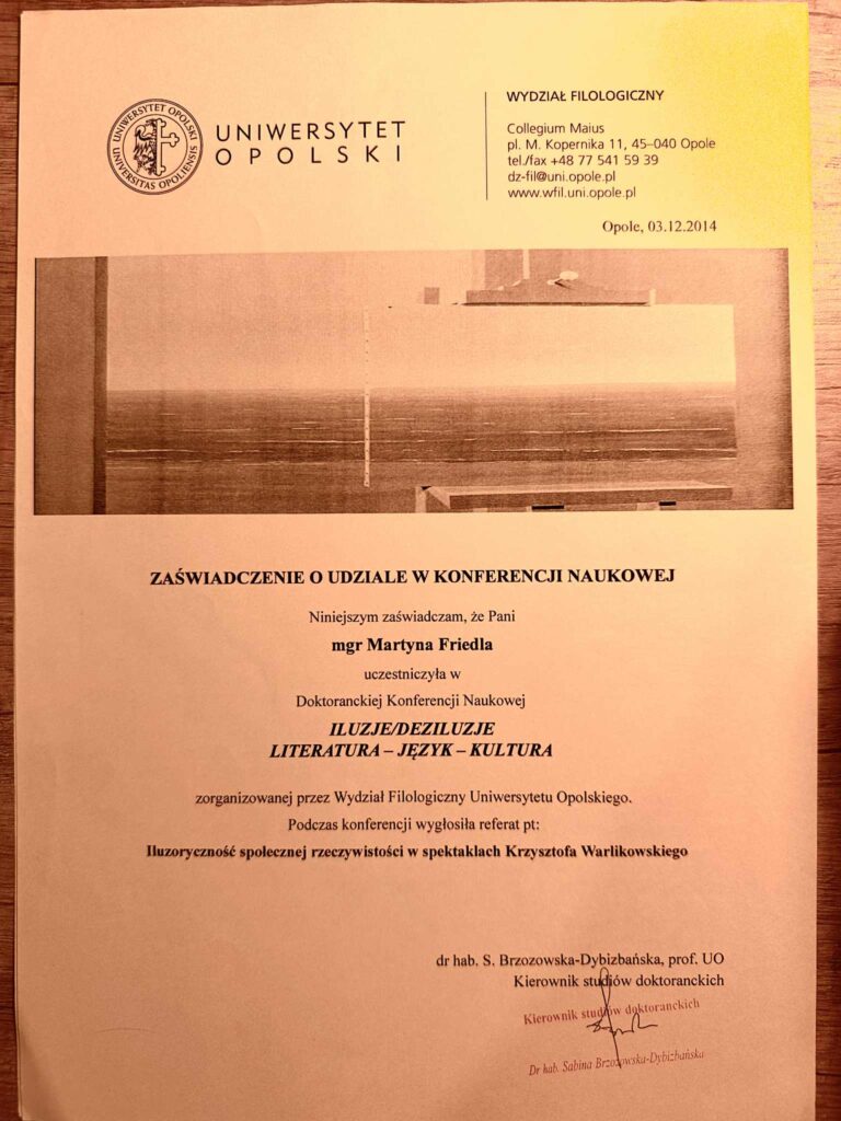 „This is to certify that Ms. Martyna Friedla participated in the doctoral scientific conference titled “Illusions/Disillusions: Literature, Language, and Culture,” organized by the Faculty of Philology at Opole University.