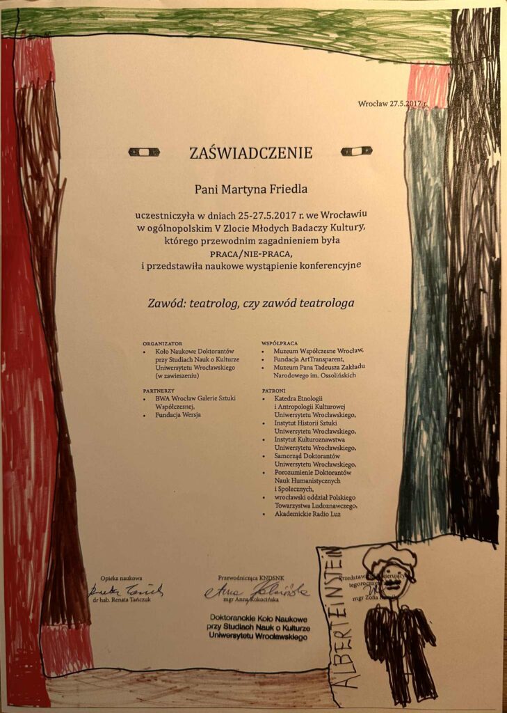 „Ms. Martyna Friedla participated on May 25-27, 2017, in Wrocław, in the National V Gathering of Young Culture Researchers, with the main topic being “Work, Non-Work,” and she presented a conference paper titled “The Profession of a Theatre Scholar or the Profession of a Theatre Scholar?”