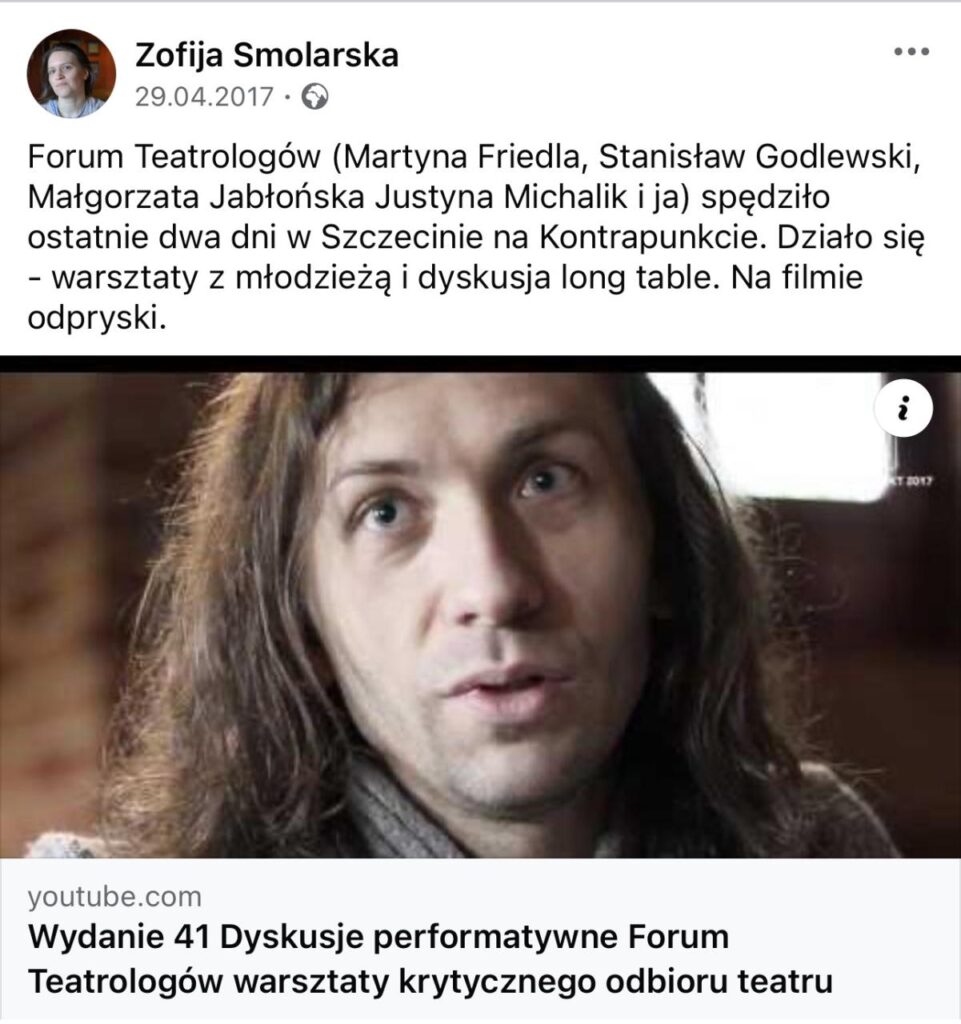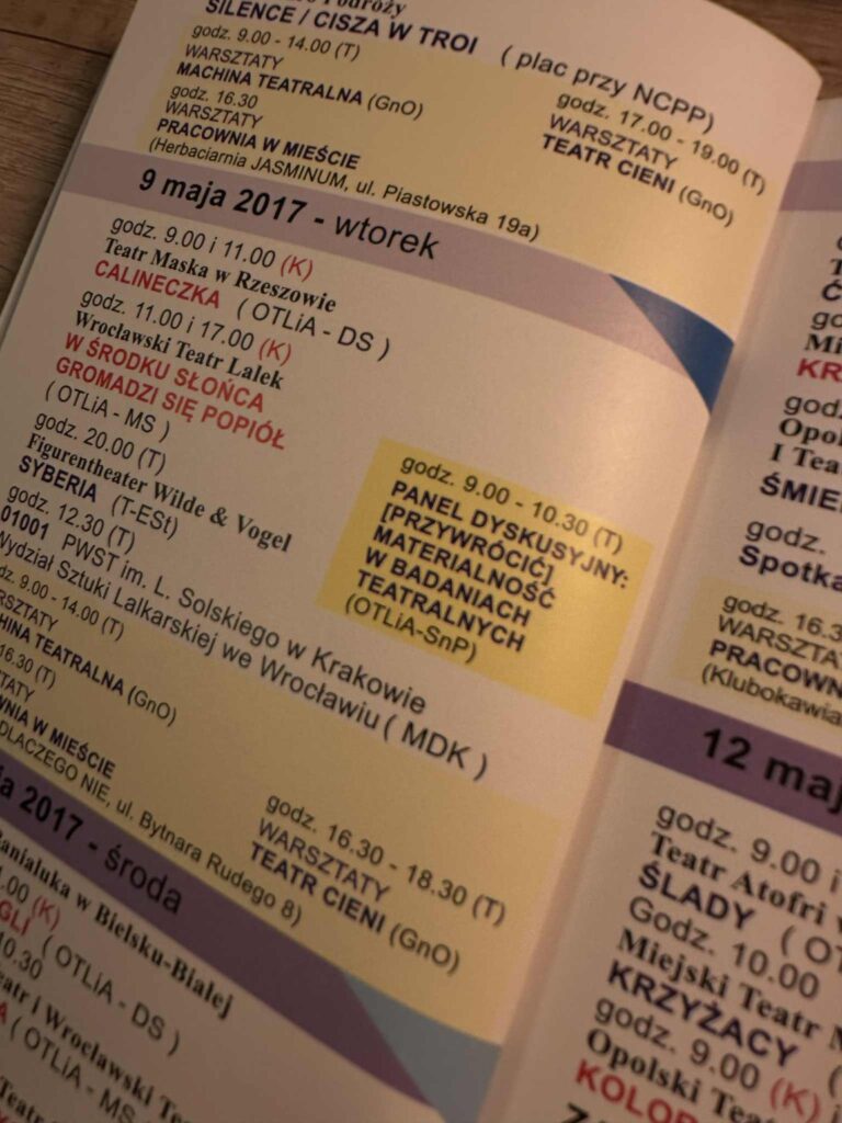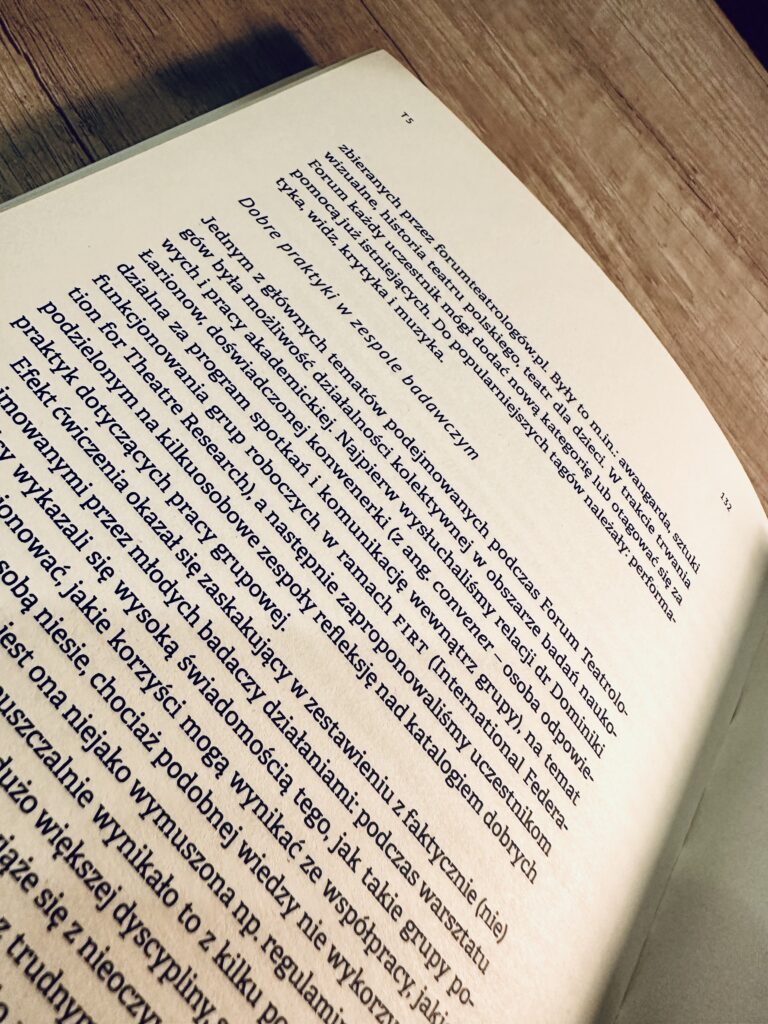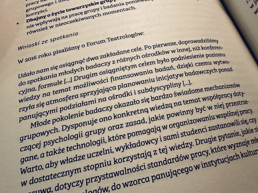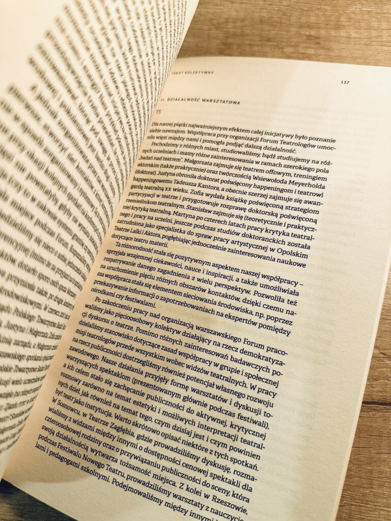 The organizers would like to thank the Theatre Institute for providing the space, covering accommodation costs for participants from outside Warsaw, and for the warmth and belief in the value of this meeting. It is also very important to us that the Forum took place under the auspices of the Polish Society for Theatre Research. This is a sign to young researchers that they are not working in a vacuum and that the path to cooperation between Forum participants and the Society is open.
