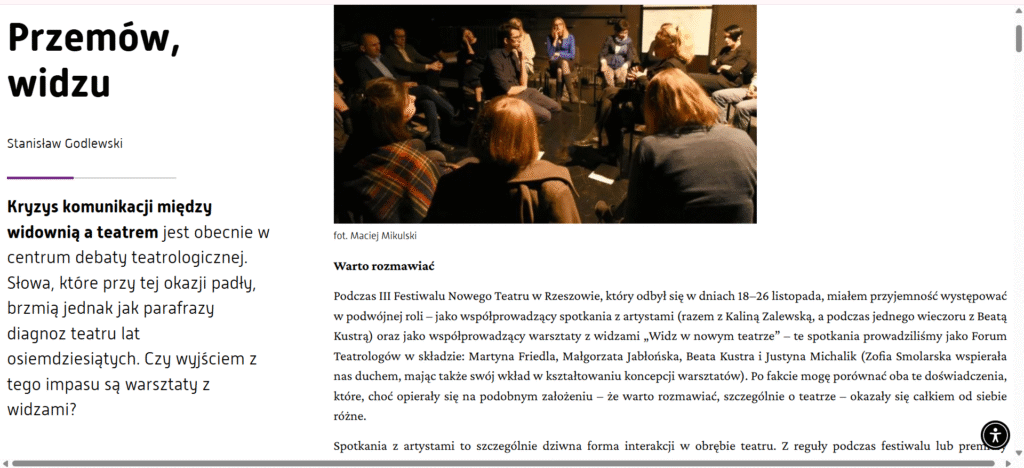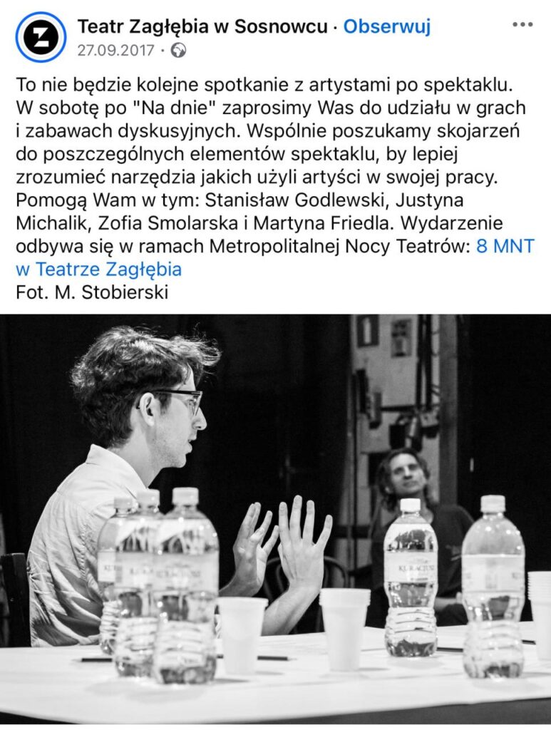 During the third Festival of New Theater in Rzeszów, which took place from November 18th to 26th, I had the pleasure of participating in a dual role: as a co-host of meetings with artists, together with Kalina Zalewska, and on one evening with Beata Kustra, as well as a co-host of workshops with the audience titled “The Audience in the New Theater.” We conducted these meetings as the Theatrologists’ Forum, consisting of Martyna Friedla, Małgorzata Jabłońska, Beata Kustra, and Justyna Michalik. Zofia Smolarska supported us in spirit and also contributed to shaping the concept of the workshops. In hindsight, I can compare these two experiences, which, although based on a similar premise that it’s worth talking, especially about theater, turned out to be quite different from each other. Meetings with artists are a particularly strange form of interaction within the theater: usually, during a festival or a student premiere, the audience stays in their seats after the performance, while the artists sit on the stage together with the moderator of the meeting, who could be a theater critic, a theater pedagogue, a curator, or a researcher…”