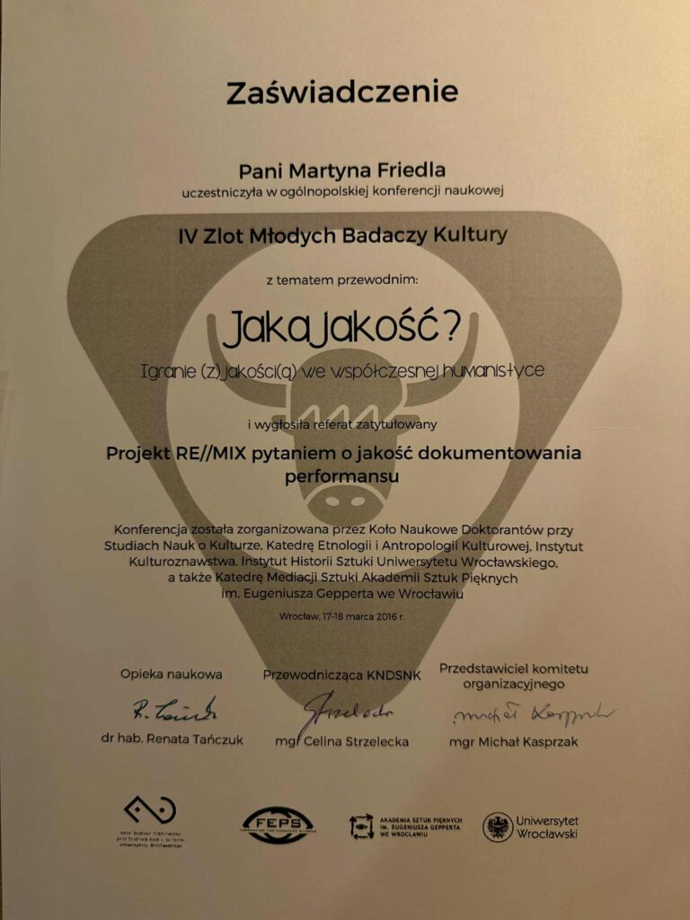 „Ms. Martyna Friedla participated in the national scientific conference “The Fourth Gathering of Young Culture Researchers” with the main theme “What Quality and Playing with Quality in Contemporary Humanities,” and she delivered a paper titled “The RE//MIX Project: A Question of Quality in Documenting Performance.”