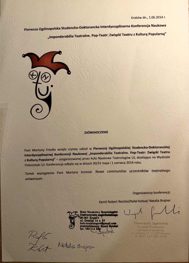 „Ms. Martyna Friedla presented a paper titled “The Response of Theatre Artists to Media Activities,” thereby actively participating in the national academic conference “Media of the 21st Century,” organized by the Association of Young Creators Kontrast, on November 5-6, 2015″.