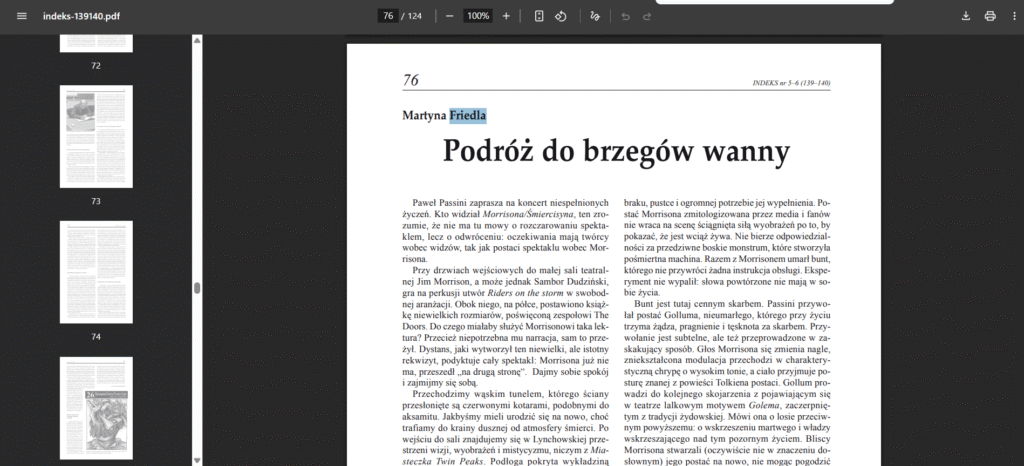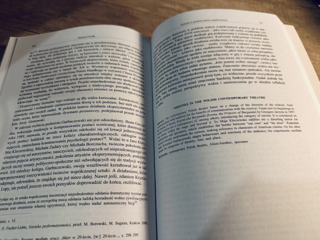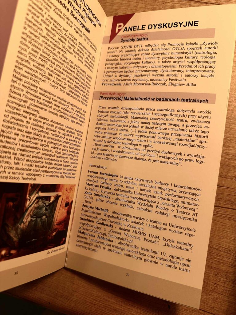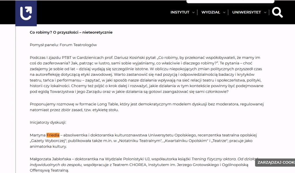 Martyna Friedla – graduate and doctoral candidate in cultural studies at the University of Opole, theatre reviewer for the Opole edition of Gazeta Wyborcza; she has also published in Notatnik Teatralny, Kwartalnik Opolski, and Teatr; works as a cultural animator”.