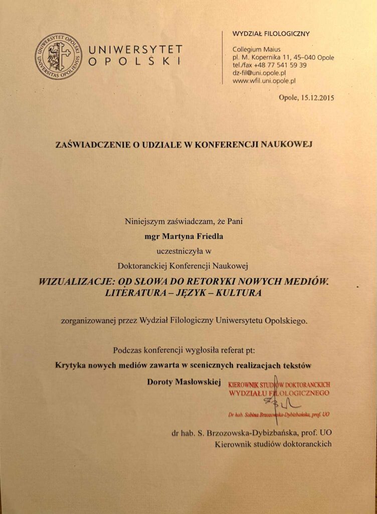This is to certify that Ms. Martyna Friedla participated in the doctoral scientific conference titled “Visualization: From Word to the Rhetoric of New Media, Literature, Language, and Culture,” organized by the Faculty of Philology at Opole University.