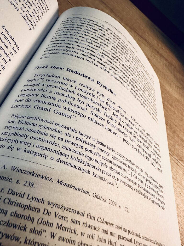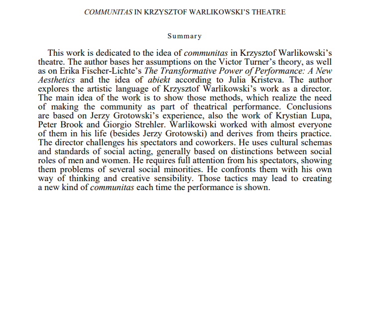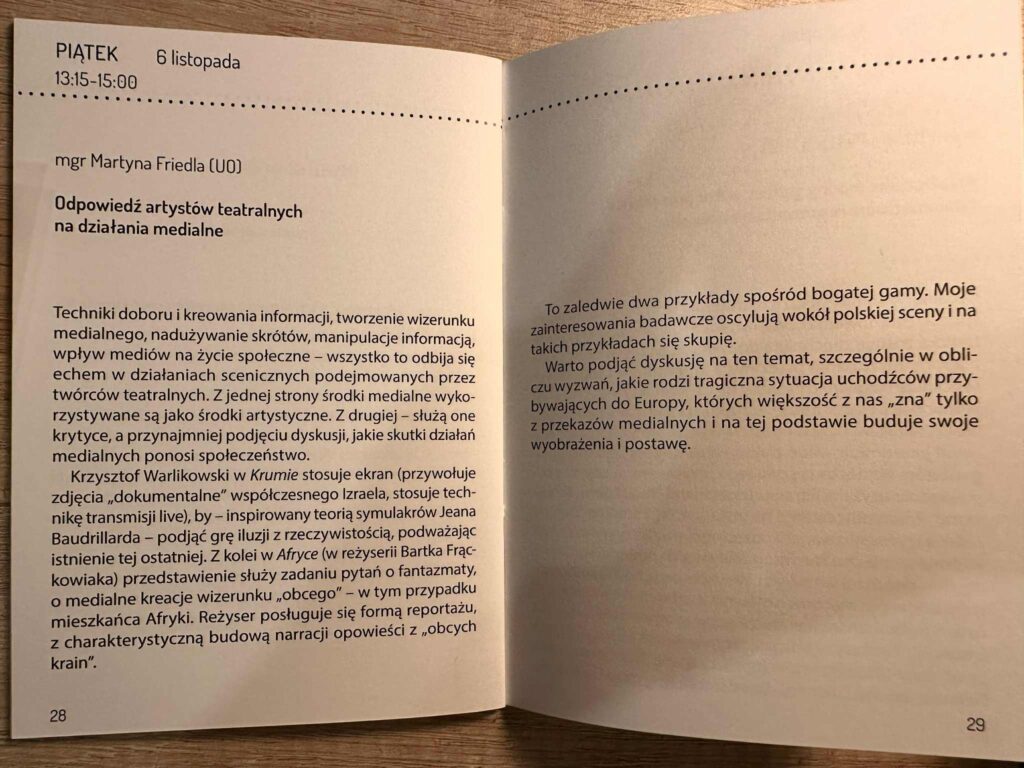 „The response of theatre artists to media activities, the techniques of selecting and crafting information, creating a media image, the overuse of abbreviations, information manipulation, and the impact of media on social life — all of this echoes in the stage actions undertaken by theatre creators. On one hand, media tools are used as artistic means; on the other, they serve as a critique, or at least as a starting point for a discussion on the societal consequences of media actions. In spectacle “Krum,” Krzysztof Warlikowski uses a screen, invokes documentary images of contemporary Israel, and employs live streaming techniques to engage with Baudrillard’s theory of the simulacrum, challenging the very existence of reality. Meanwhile, in “Africa,” directed by Bartosz Frąckowiak, the performance raises questions about the media-created phantom image of the “other,” in this case, the inhabitants of Africa. The director uses a reportage form with a distinctive narrative structure of stories from distant lands. These are just two examples from a rich spectrum, and my research interests focus on the Polish stage, so I will center on such examples. It is worth discussing this, especially in light of the challenges posed by the tragic refugee situation in Europe, which most of us „know” only through media coverage, shaping our perceptions and attitudes”.