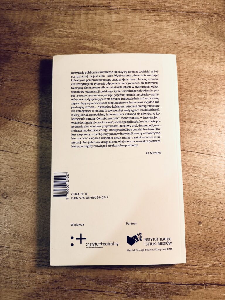 „From an introduction: Public institutions and independent creative collectives in Poland today are no longer a matter of either-or. The idea of an absolutely free collective contrasted with a traditionally hierarchical institutional structure not only fails to reflect reality but also creates a false alternative. However, in recent debates about the organization of the Polish theater scene, this opposition has been drawn quite simply and starkly: on one side, the institution, privileged, with a stable subsidy and proper infrastructure, providing financial and social security for its employees; on the other side, the independent collective, perpetually poor, constantly scrambling for another grant that’s always too small. Yet, if we examine other values, the situation reverses: in collectives, there is equality, freedom, and diversity; in institutions, hierarchy, specialization, the need to reconcile with many constraints, a painful lack of democracy, waste of human energy, and unfair distribution of resources prevail. Those who are tired and disheartened by institutional work dream of a collective; those who are fed up with the shared poverty dream of anchoring in an institution. Neither has an external partner to help solve their structural problems”.
