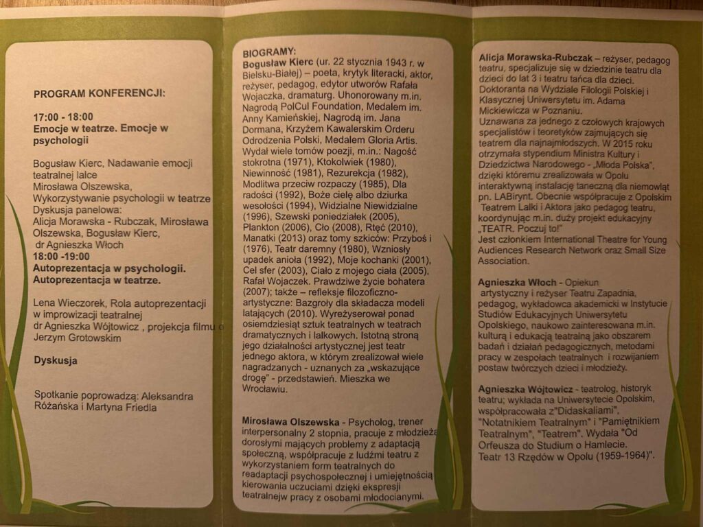 Podczas tego wydarzenia zajmowałam się współprowadzeniem dyskusji i pomocą w organizacji tego wydarzenia w Opolskim Teatrze Lalki i Aktora we współpracy z psychologami z Uniwersytetu Opolskiego.