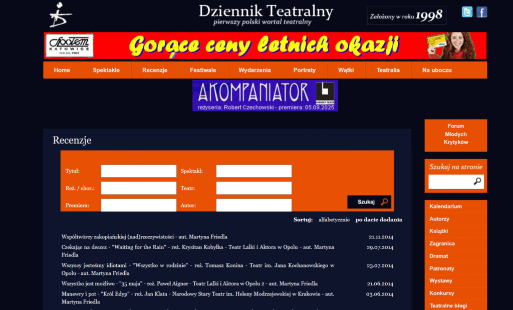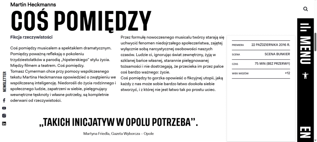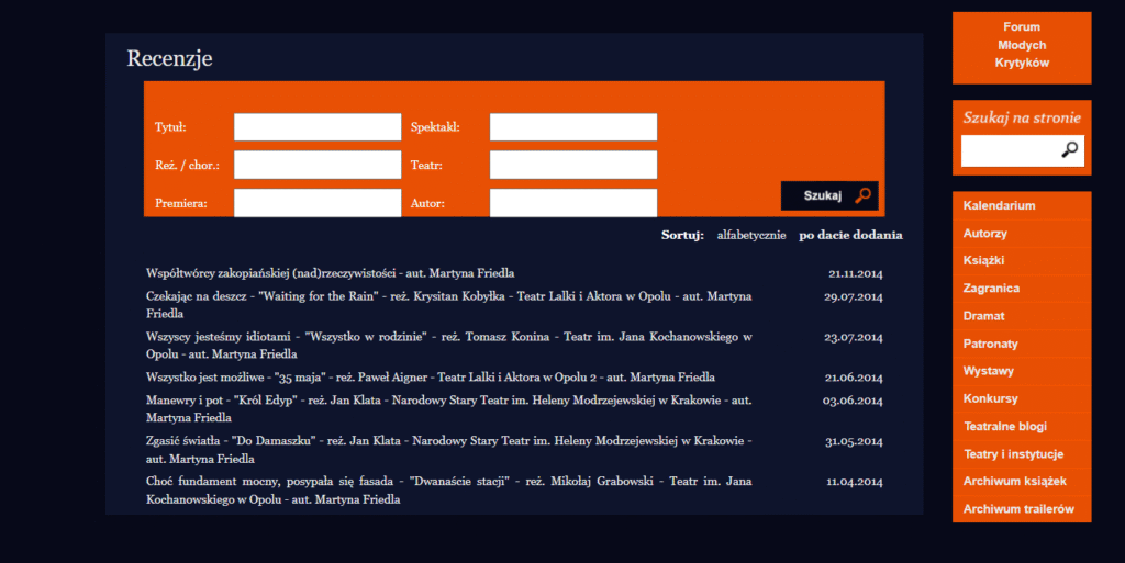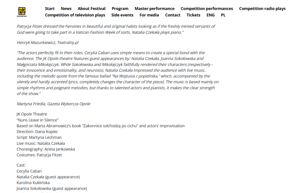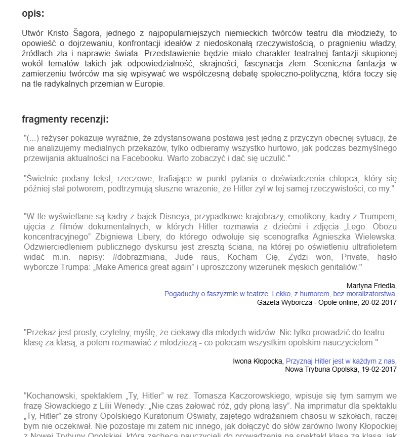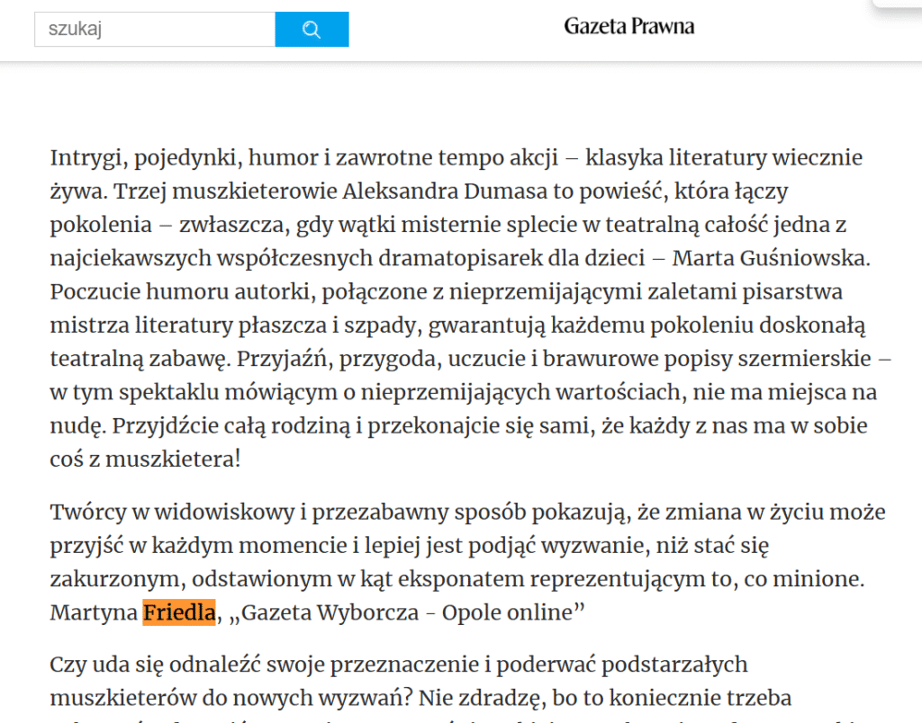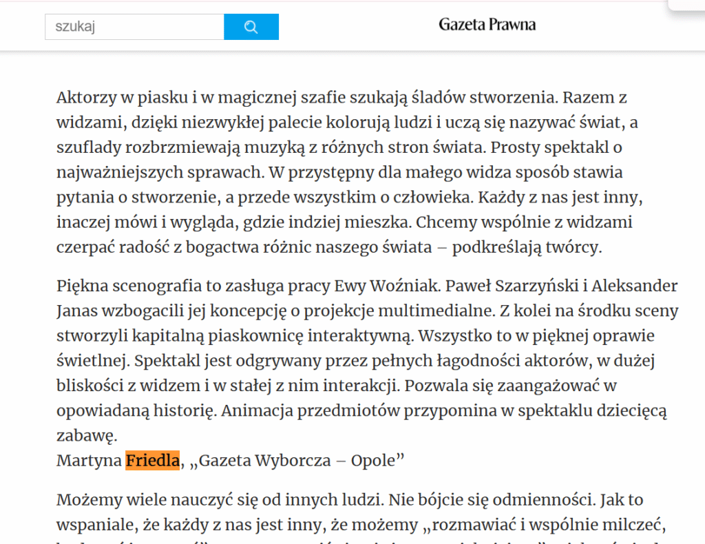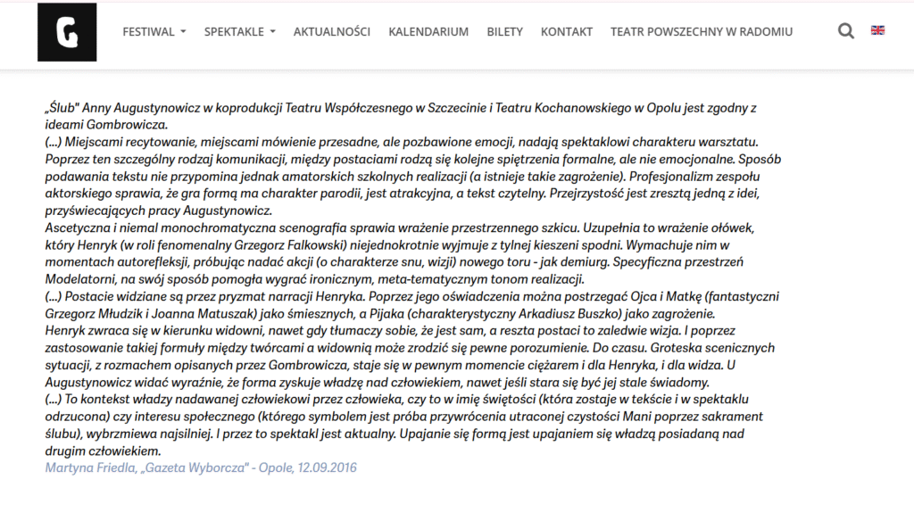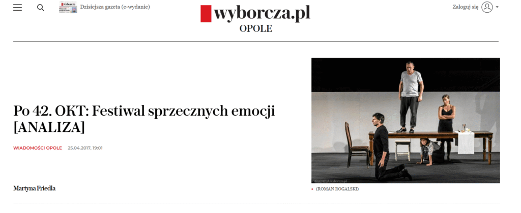 Martyna Friedla – graduate and doctoral candidate in cultural studies at the University of Opole, theatre reviewer for the Opole edition of Gazeta Wyborcza; she has also published in Notatnik Teatralny, Kwartalnik Opolski, and Teatr; works as a cultural animator”.