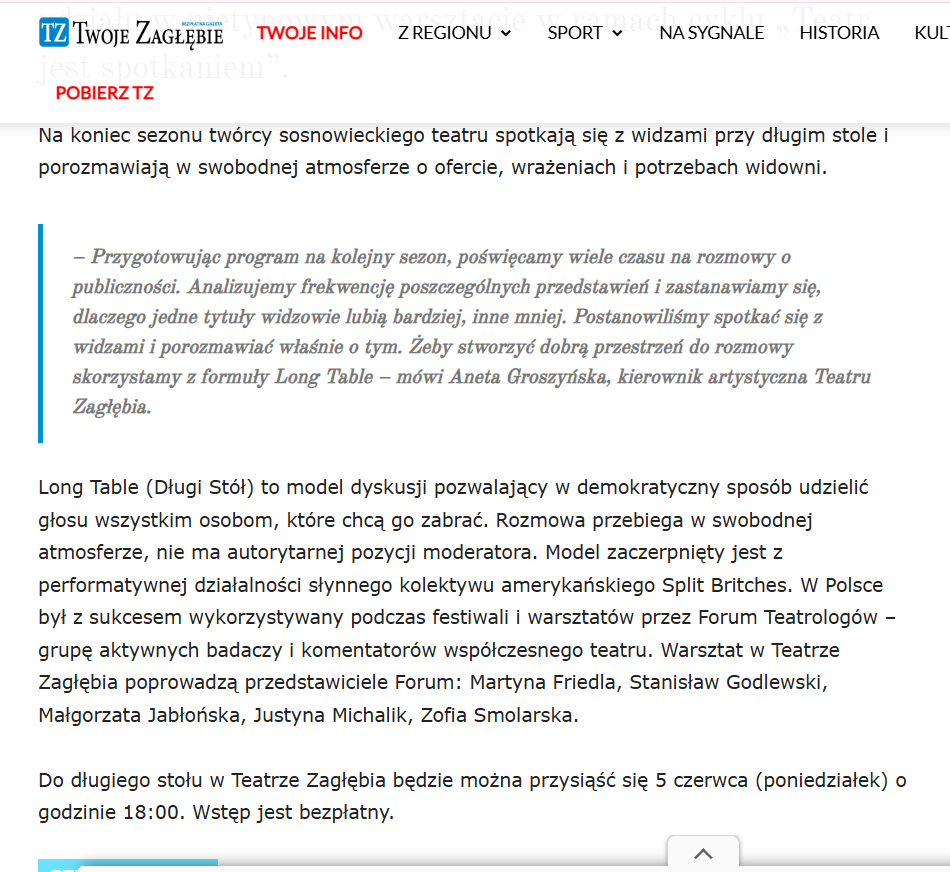 „At the end of the season, the creators of the theater in Sosnowiec will meet with the audience at a long table to talk in a relaxed atmosphere about the theater’s program, impressions, and the audience’s needs.