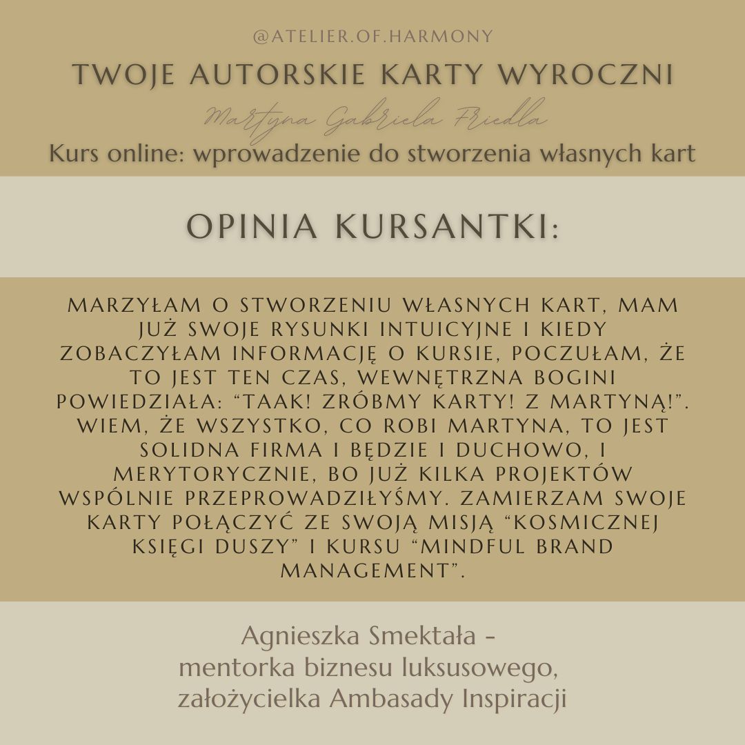 W międzyczasie dokumentowałam swój proces pracy nad Kartami – i robię to dalej – ponieważ osoby, które marzą o wykonaniu swoich Kart, cenią sobie możliwość skorzystania z mojego bogatego doświadczenia w zakresie pracy z procesami twórczymi i biznesowymi. Moja umiejętność budowania przestrzeni rozwoju sprawdziła się w wielu środowiskach i branżach edukacyjnych, kreatywnych i rozwojowych w całej Polsce od 2007 roku, a od 2019 roku tworzę je również online.