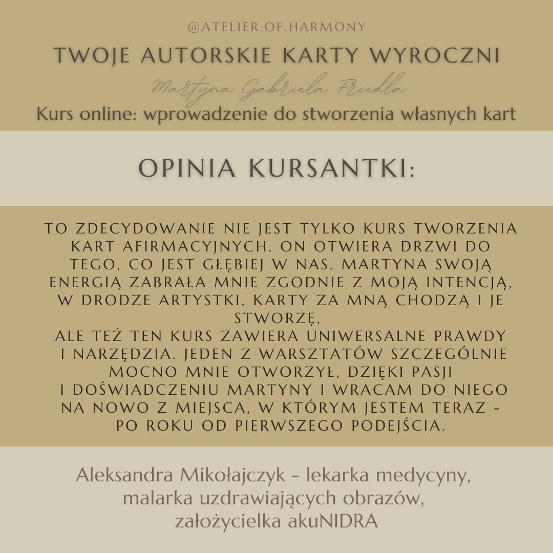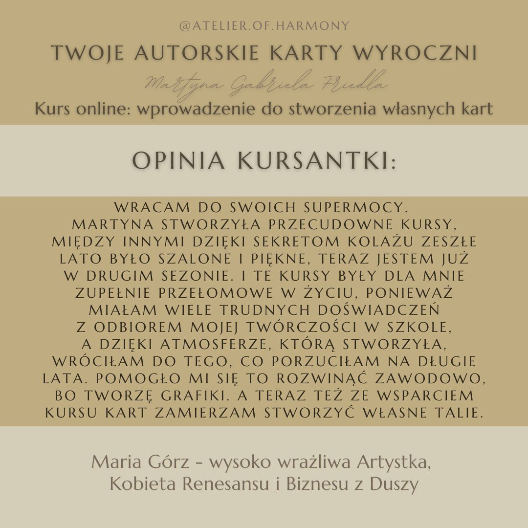 - szukasz kursu, w którym ktoś przedstawi Ci gotowiec i wymyśli karty za Ciebie, będzie Cię prowadził za rączkę i odpowiadał na wszystkie pytania – pamiętaj, że to jest kurs pasywny, pracujesz z nim sama i sama robisz swoje karty swoimi technikami,